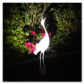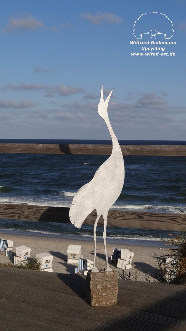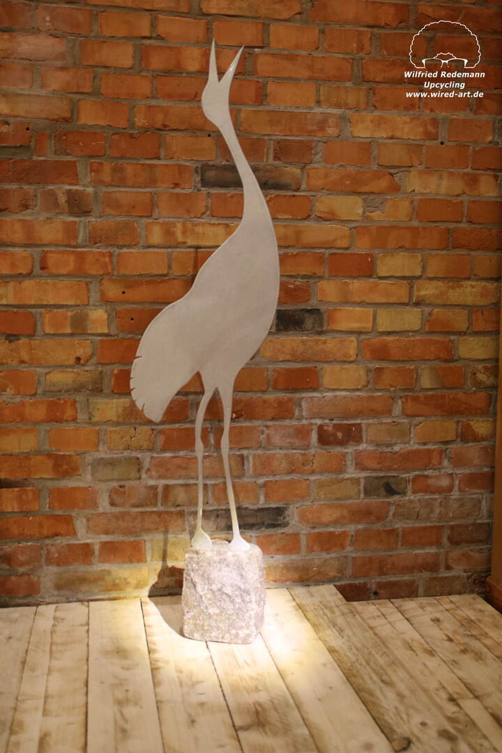 Dieser Kranich ist aus Aluminum und hat einen Granitsockel.