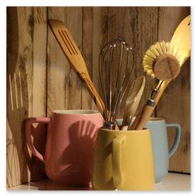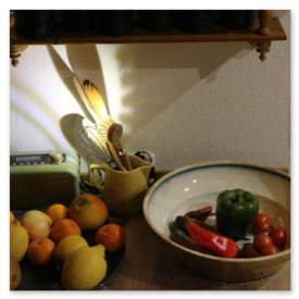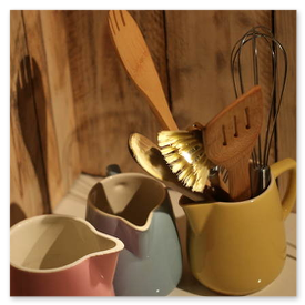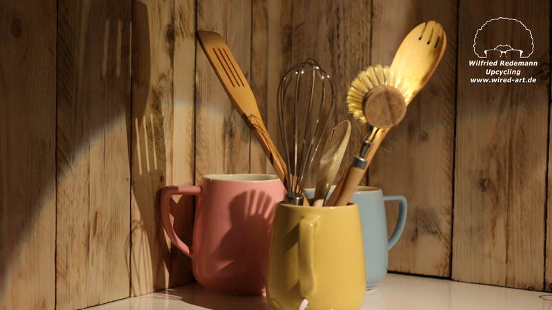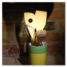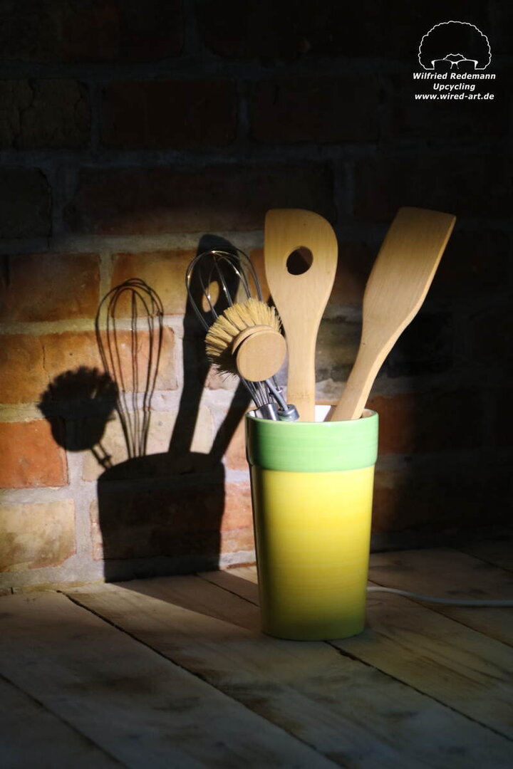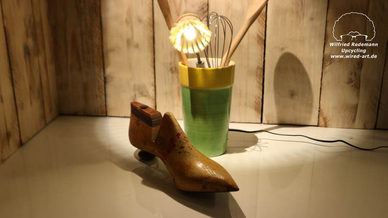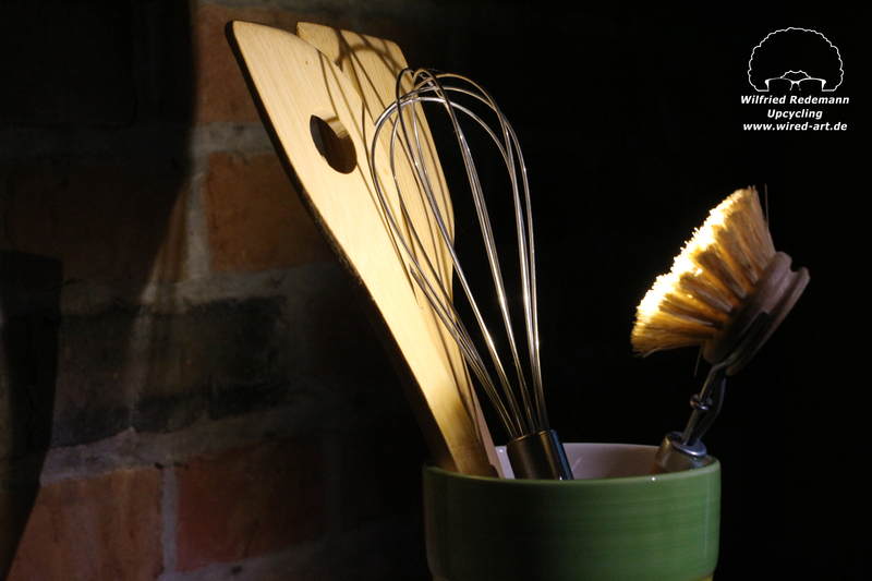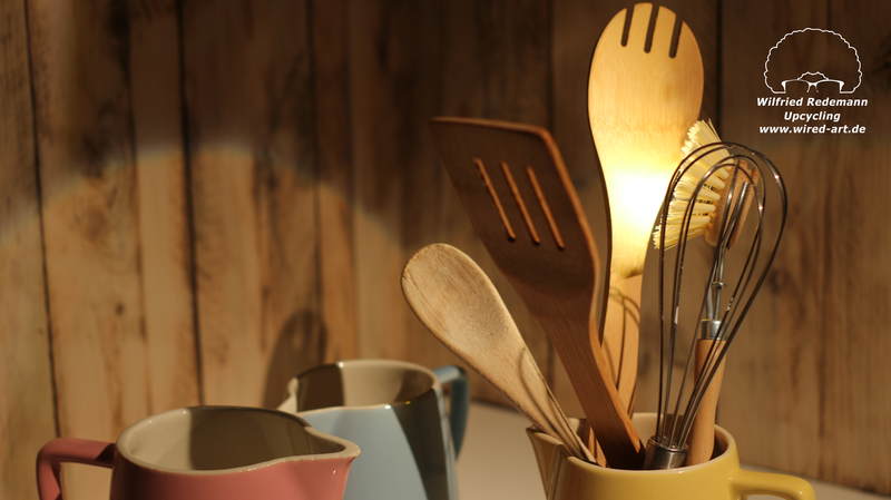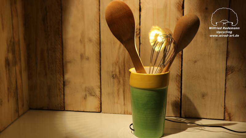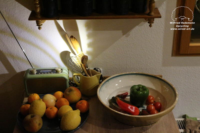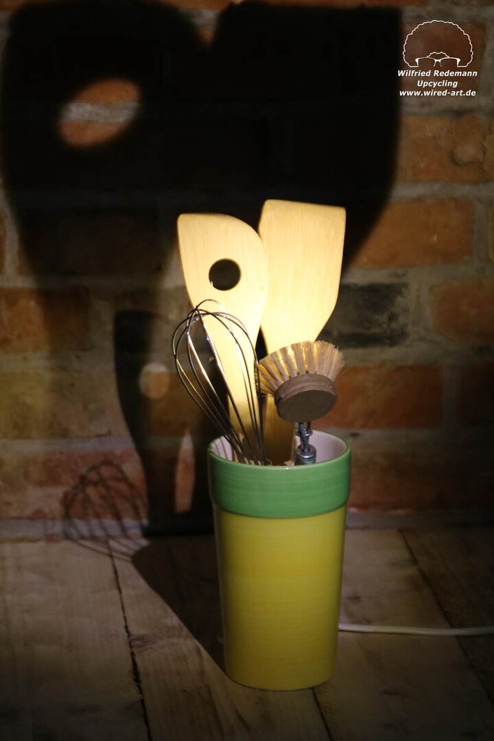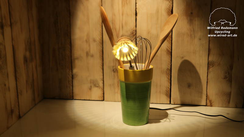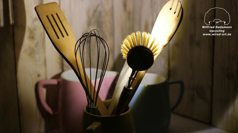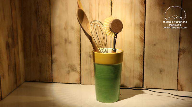 Unikate aus Spülbürsten und Keramikgefäßen, nettes Licht in der Küche.