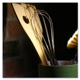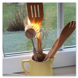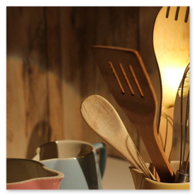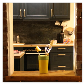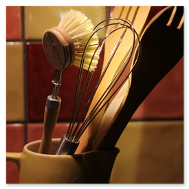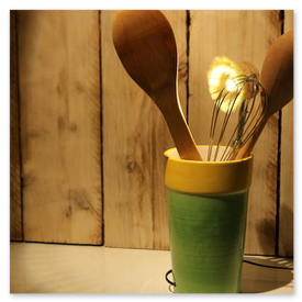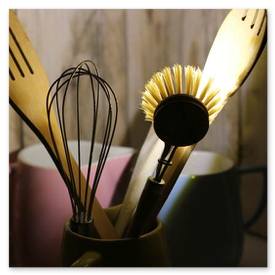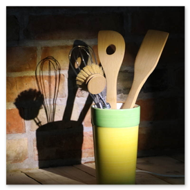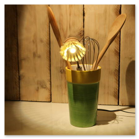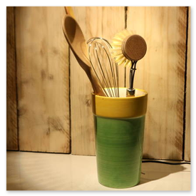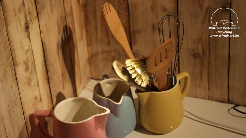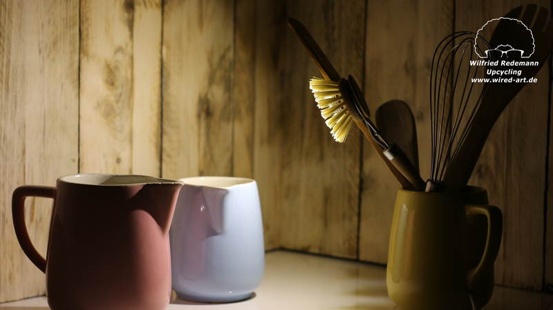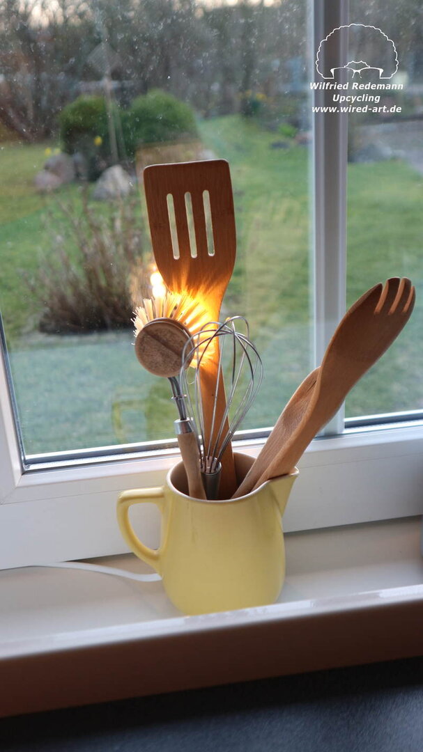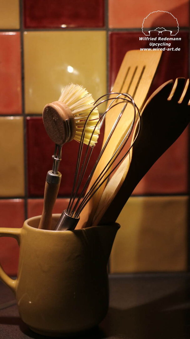 Unikate aus Spülbürsten und Keramikgefäßen, nettes Licht in der Küche.